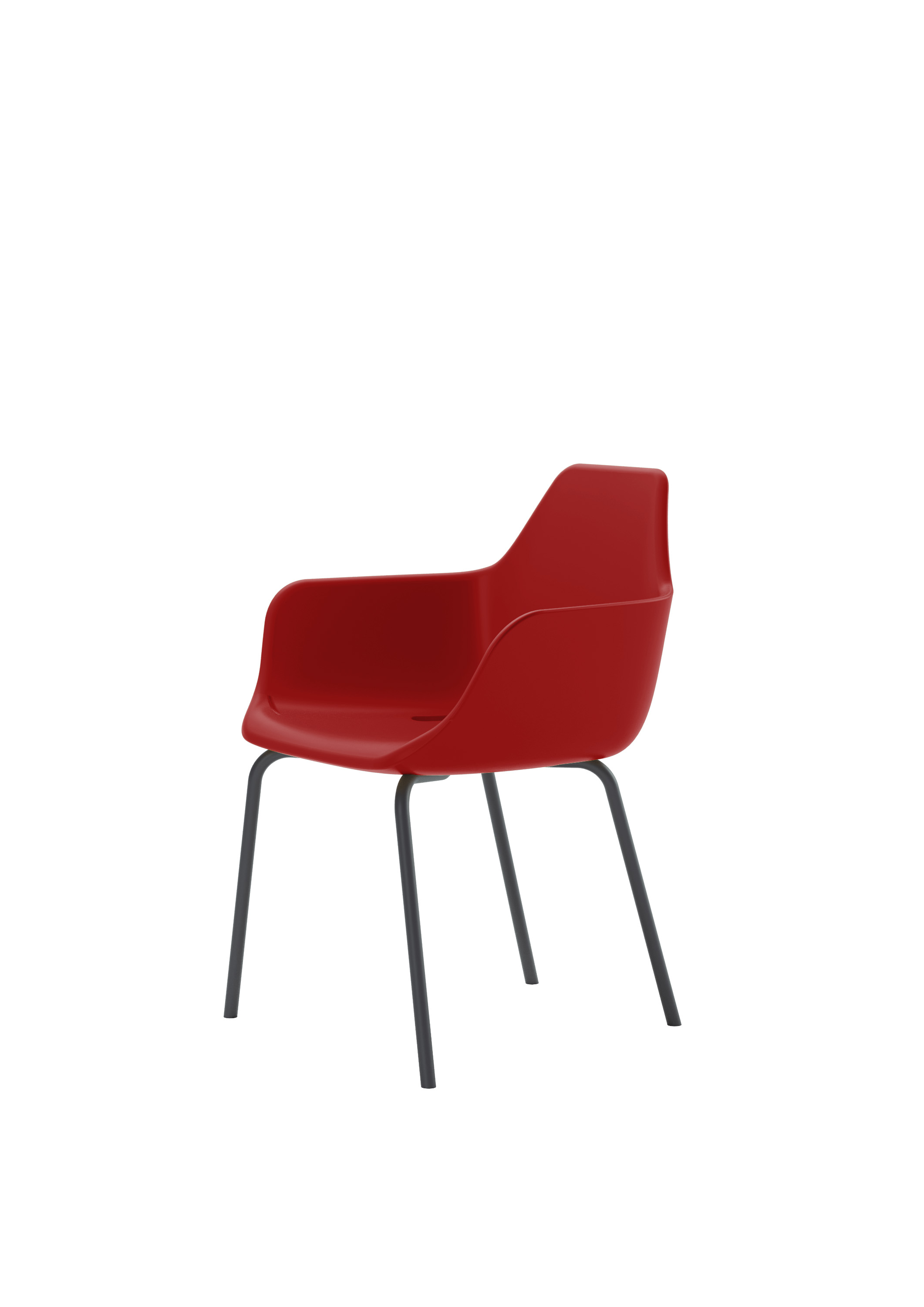 Poltroncina con struttura color antracite e scocca in polietilene color rosso dal design moderno e dinamico, caratterizzata da linee pulite e decise.